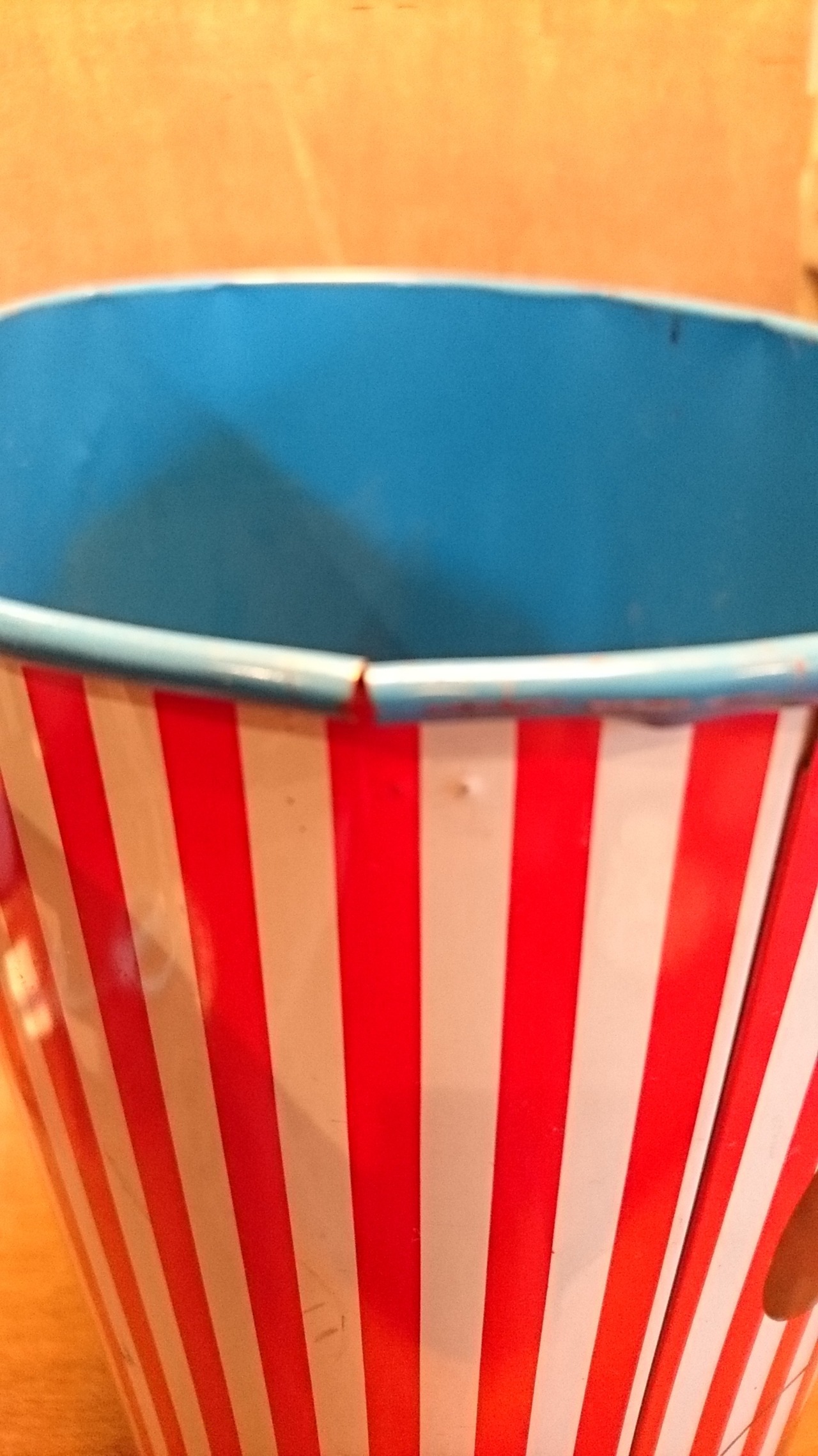 年代相応の小傷、内側に錆びと汚れ、縁に1か所切れがあります。