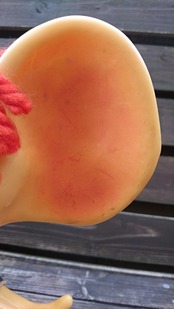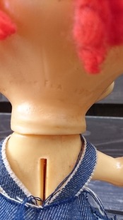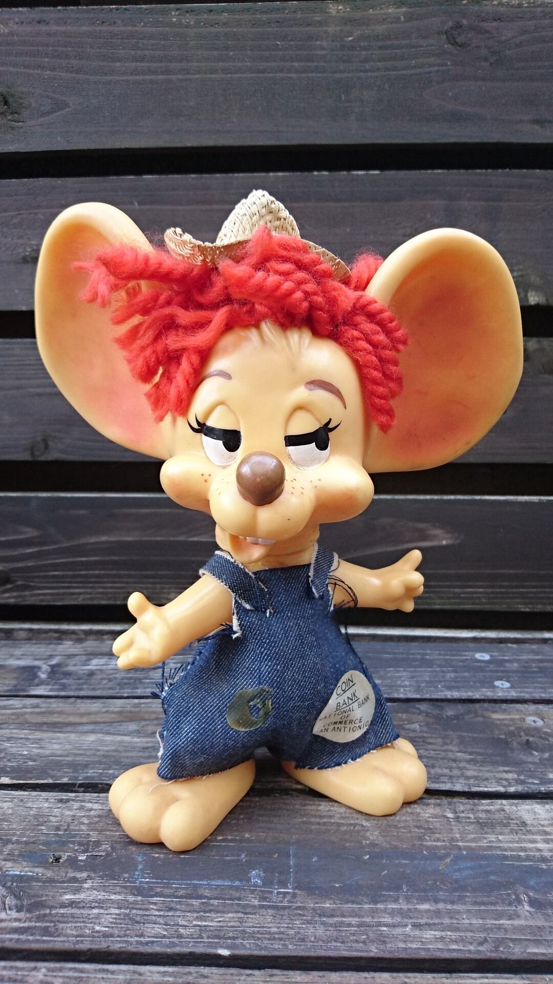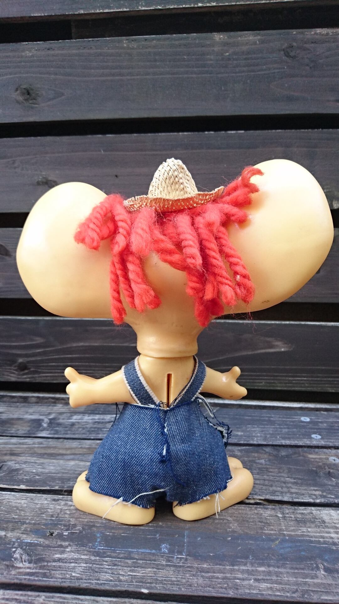 銀行の販促用に作られ、さまざまな種類があります。こちらは麦わら帽子を被りデニム生地のオーバーオールを着たバージョンです!